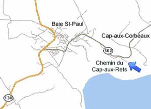 Vous traverserez le village de Baie-Saint-Paul et vous rencontrerez à votre gauche l’enseigne du « Balcon vert » et à votre droite, tournez sur le Chemin du Cap-aux-Rets.
