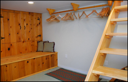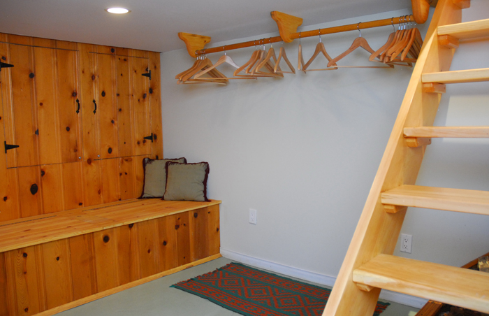 La sécheuse se retrouve au sous-sol dans une pièce aménagée pour le rangement,